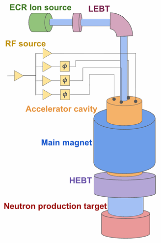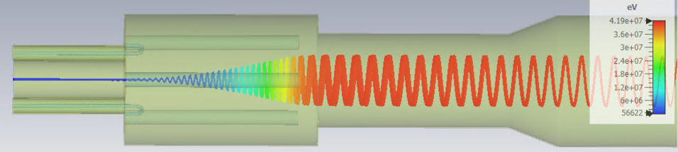 The blue-to-red spiral curve in the simulation result at the right is a trace of the trajectory and energy gain of a short beam segment. This result, obtained with CST-Studio, is proof of the validity of our design concept, with high-current un-bunched acceleration without beam breakup or beam reflection, insofar as a simulation can be taken as a reliable prediction of actual performance. A high-energy beam transport line (not shown) within which the beam will travel down to the deuteron breakup target, from which the neutrons will emerge, uses a reverse magnetic field to convert most of the particles’ momentum from transverse to longitudinal. Consequently, the beam will sweep automatically over a large and adjustable area, thereby diluting the specific power density that the target must sustain, and thus eliminating any need for a separate scanning or rastering device.