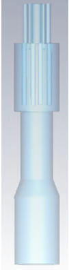Our patented concept for dCARA lies in its use of a TEM rotating mode quarter-wave cavity immersed in a resonant axial magnetic field as the accelerator structure. It uses four off-axis rods, as shown at the right, that support and shape fields in the center of the structure. A low energy (60 keV) beam is injected at the top, and the high-energy (40 MeV) beam emerges at the bottom. Dimensions for the prototype structure we plan to build are 1.0m length and 0.7m diameter. These allow the structure to fit within the warm bore of a superconducting solenoid. Four RF couplers excite a rotating symmetric TEM mode. Beam dynamics simulation results on this structure are shown on the following page. Operating at 75 MHz with an axial magnetic field of 10T, the results show that an injected 140 mA 60-keV deuteron beam can be accelerated to 40 MeV with an efficiency of 70%.